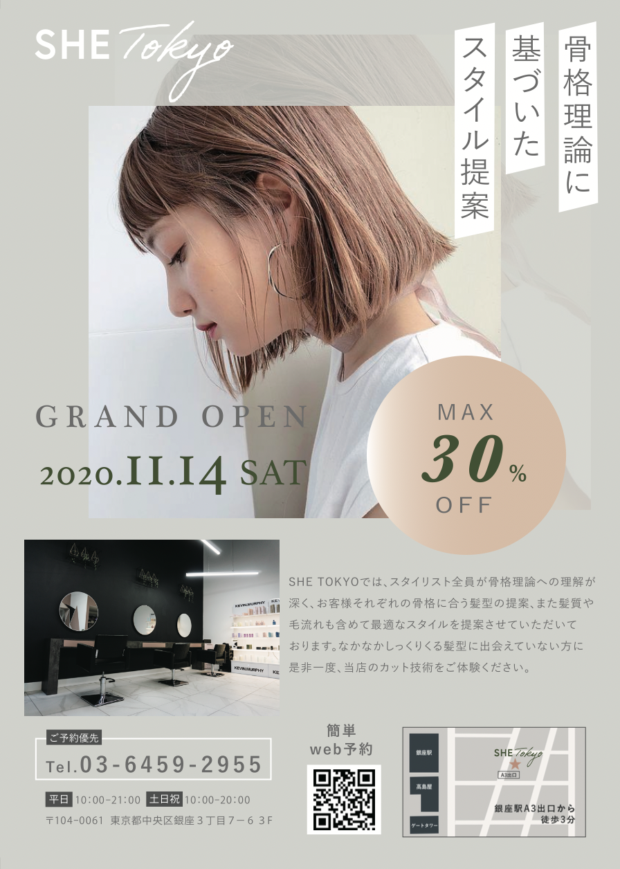 SHE Tokyo(架空)▶︎ 銀座に拠点を構える、骨格理論に基いたスタイル提案が売りの美容室。オーダーしていただいた髪型をそのまま再現するのではなく、一人ひとりの骨格や髪質に合わせて最大限似合うようにカスタマイズし仕上げることを得意としている。