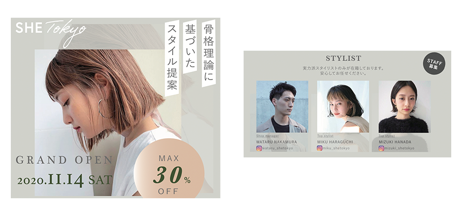 情報をZ型の視線誘導でインプットできるよう設計しました。その中でも、クライアントの売りポイントである「骨格理論に基いたスタイル提案」、グランドオープン&キャンペーンの情報 が特に目に入るよう大きく表示させました。