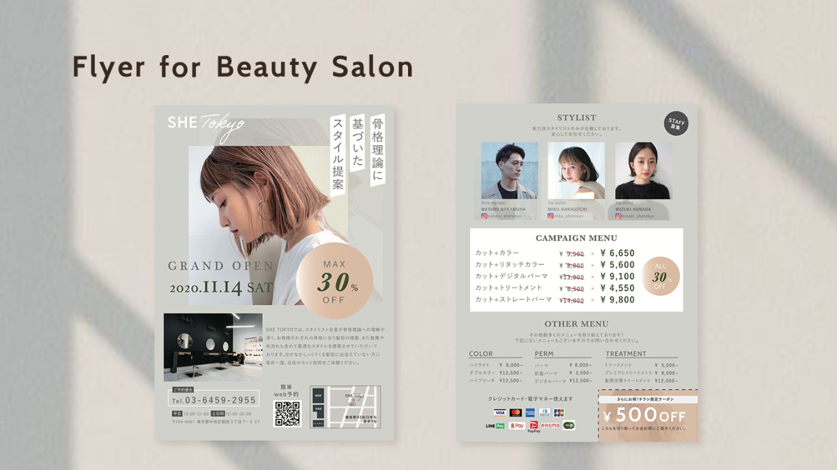 SHElikes MULTI CREATOR COURSEの課題で、骨格理論に基いたスタイル提案が売りの美容室の特別キャンペーンフライヤー制作に取組みました。(制作時間:18時間)