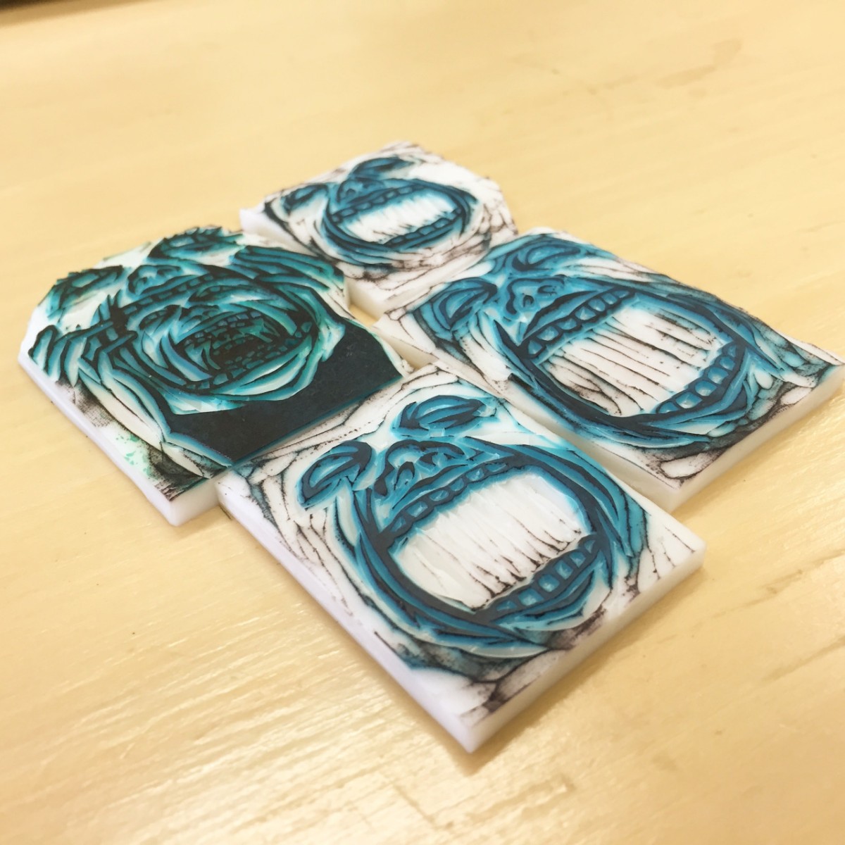 ビジュアルの制作のために用意した消しゴムハンコ。彫り跡をくっきりとさせて荒々しく表現した。