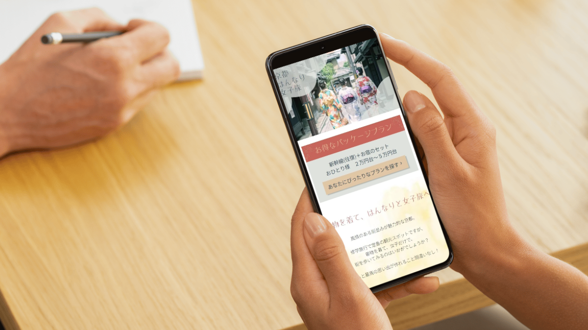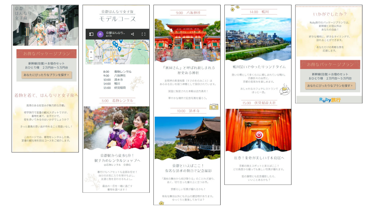 LPでは女性の方に楽しんでいただける京都旅行モデルコースを紹介し、パッケージプランの検索ページに誘導する流れで作成をお願いいたします。