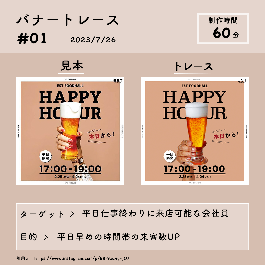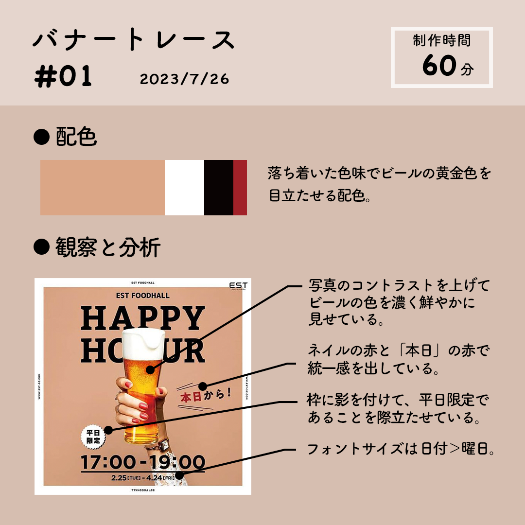 バナートレース aya OVERVIEW ESTのハッピーアワーのバナーをトレースしました。 初めてのバナートレース作品です。 作品のトレースと併せて分析も行いました。 YEAR 2023 ●トレースしたバナーと、バナーのターゲット、目的●配色・観察と分析のまとめ