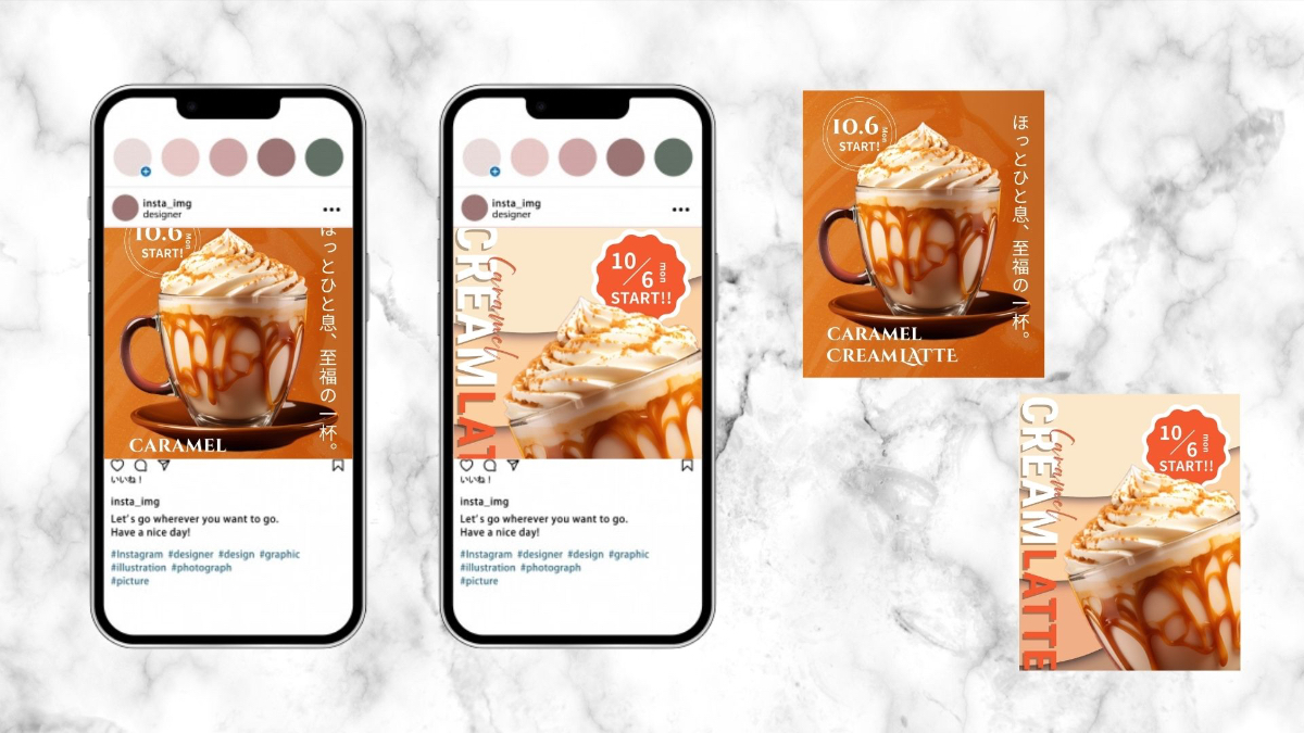 ・どちらも温かみを感じて貰えるよう、キャラメルの色味と統一感を出すため1枚目はキャラメルの背景を使用、2枚目はオレンジ系を多く使用しました。