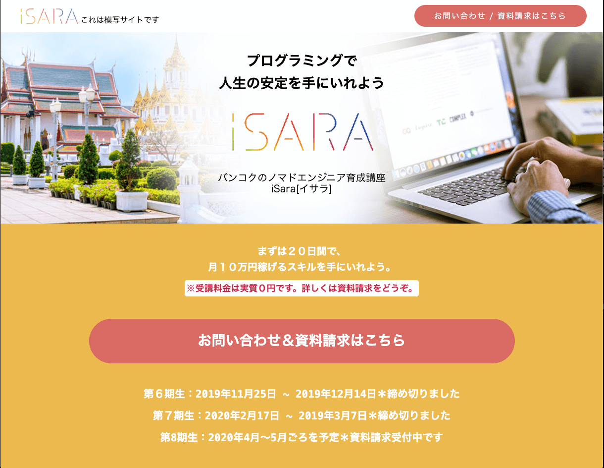 isaraというLPサイトを模写しました。デザインカンプがないので完全一致ではありません。jQueryでアコーディオンやTOPへ行くボタン、ページ内遷移などを実装しました。