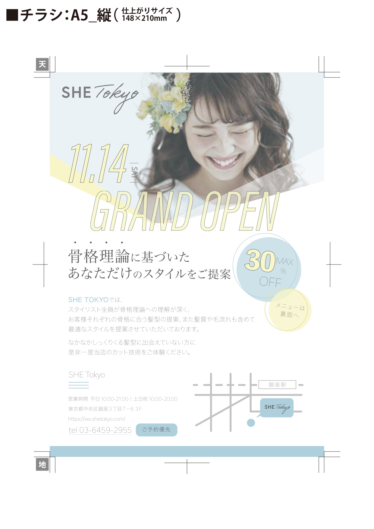 SHElikes マルチクリエイターコースの課題で架空の美容院のGRAND OPENのフライヤーを作成しました。【制作期間:1週間】【使用ツール:Illustrator】