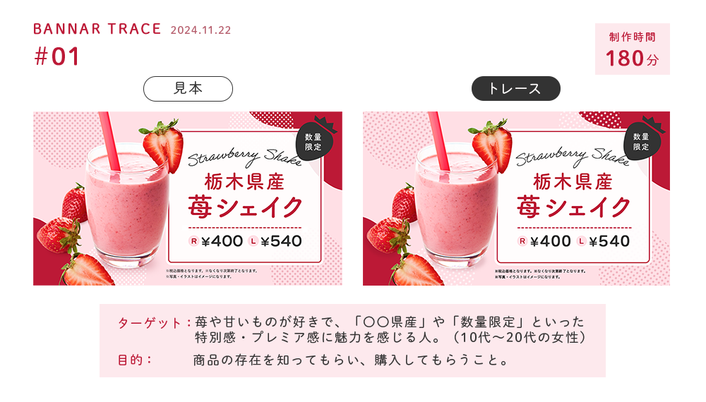 手本となるバナーをトレースし、まずはPhotoshopというデザインツールに慣れることができました。トレースを通して、クオリティの高いデザインを作ることのできる技量や、様々なデザインのアイデアをインプットすることが重要であると学びました。