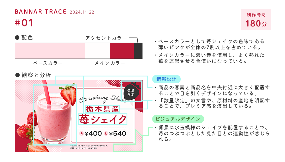 SHElikes MULTI CREATOR COURSEの実践課題としてバナートレースを行いました。また、見本バナーの「ターゲット」「目的」「配色」等についての分析結果もまとめました。