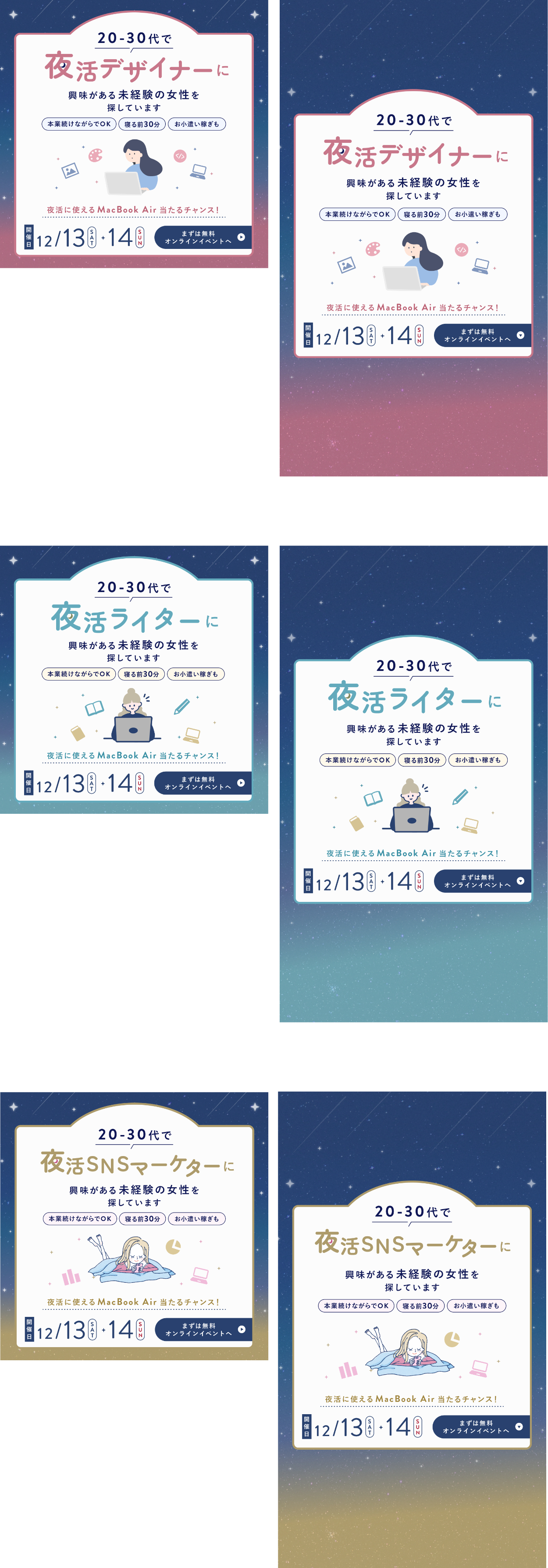 - 夜の雰囲気が伝わるように夜空のようなグラデーションや星・月のあしらいを使用しました。