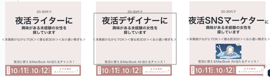 - 職種ごとに違うCRに見せたいため、ポイントとなる色味とイラストを変えてほしい。
