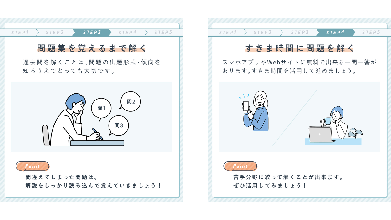 STEP1〜5を各ページ上部に記載することにより、現在のSTEPが全体のどの位置なのか一目でわかりやすいように工夫いたしました。