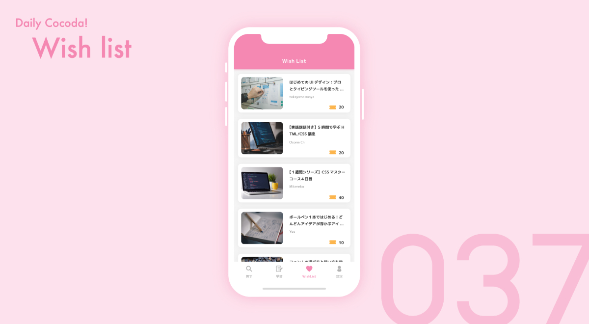 Wishlistはピンク色ですが、探す、学習、設定は別のパステルカラーになります。(探すは黄緑、学習は青など)