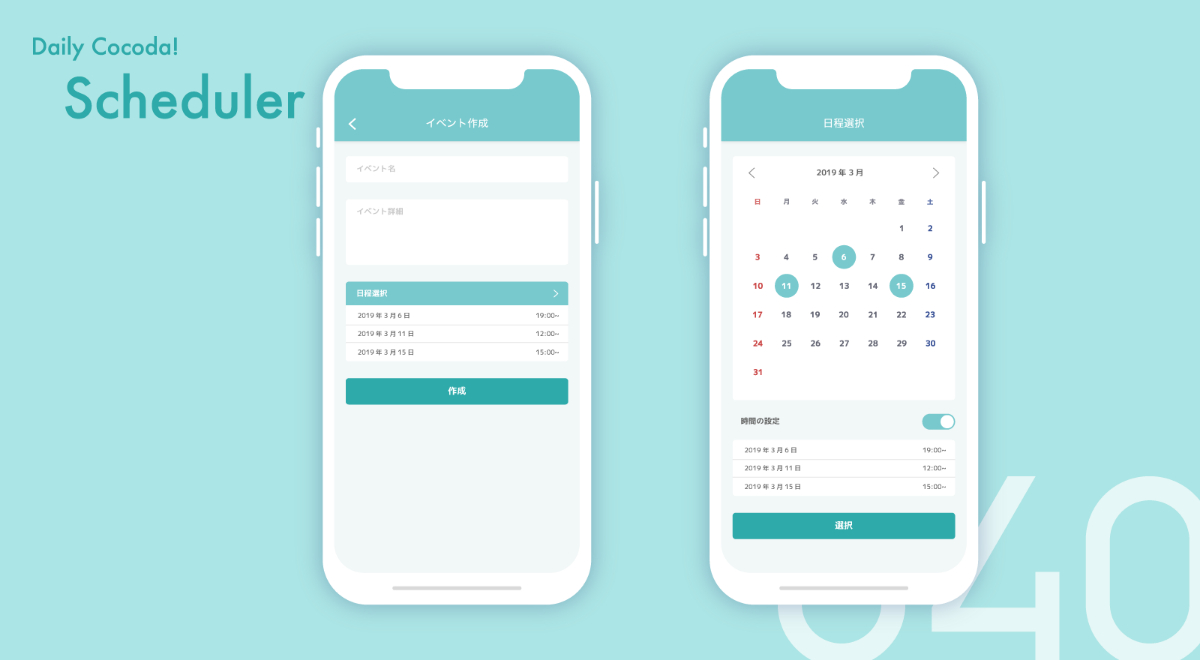 日程と時間の両方を設定しようとすると場所を取ってしまうのですが、Lineスケジュールを使用している時に、時間の設定は必要だと感じていたので、調整くんの機能を参考にスマホのUIに落とし込みました。