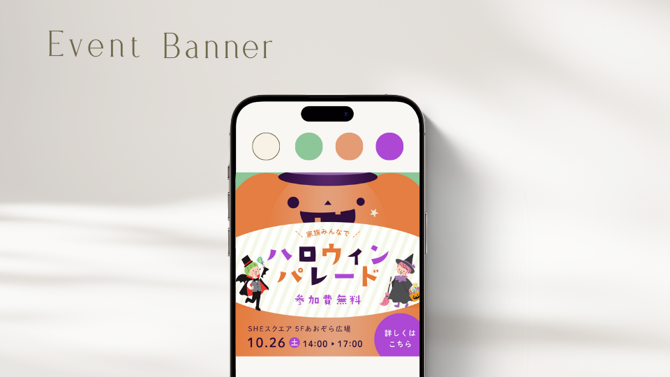 仮装をしてお菓子を持ち、楽しそうにしている子どものイラストを使用することで、「うちの子も楽しめそう!」と想像してもらいやすいバナーに仕上げました。