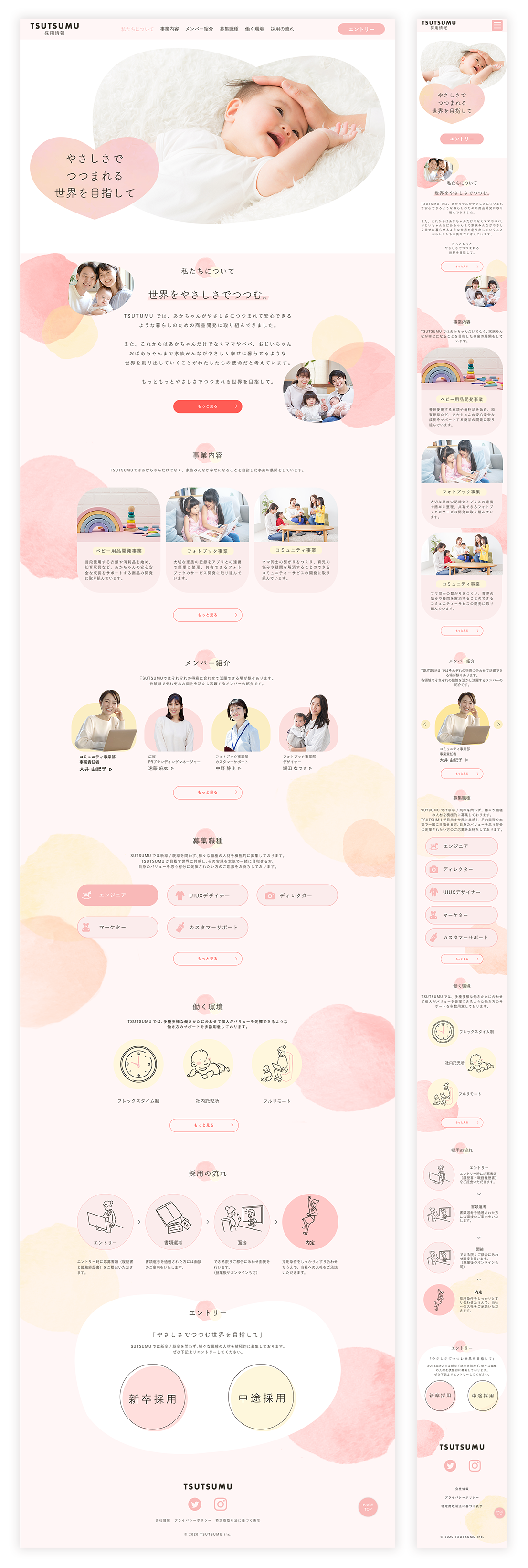 - メインビジュアルでは企業のコンセプトを心に入れるイメージをハートで表現しました。また、赤ちゃんの写真枠の形は赤ちゃんのシルエット(曲線)イメージで角の無いハート型にしました。同じ形をエントリー部分でも配置しており、背景色が柔らかいピンクが続く中でエントリー部分が目立つよう、引き締めや緊張感を狙いメインビジュアルと同じ「白」を選択しました。