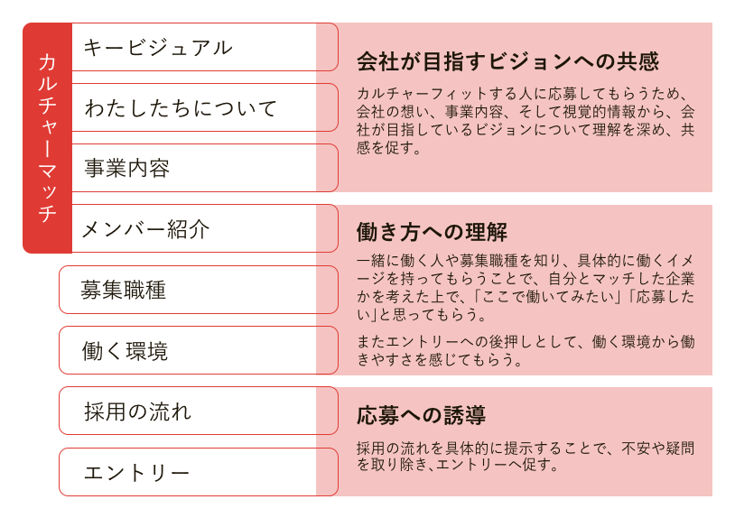 LP上部で企業が目指すビジョンへ共感してもらい、下部につれ働き方を理解いただき、ここで働いてみたい!という気持ちが上がったところで最終的にエントリーいただくことを狙いとしています。