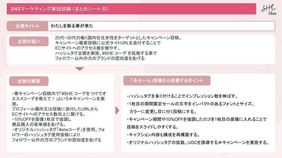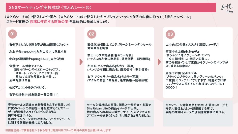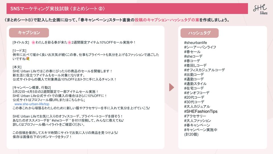 SNSマーケティング企画 平川 美希 マーケター/WEBディレクター/キャリアプランナー OVERVIEW 学習スクールの課題で架空ファッションアカウント"SHE Urban Life" の 「春キャンペーン」を盛り上げるために Instagramアカウントで初回投稿する内容を企画しました。 YEAR 2024
