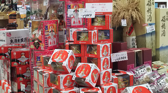 ・瓶モノの商品はお土産需要を狙い、ラッピングしたものも陳列し訴求。