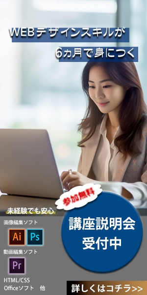 バナー制作01 オオヒラ アイ OVERVIEW WEBデザイン学校のバナーを制作いたしました。 336×280300×600728×90概要制作時期:2023年6月制作時間:約1時間使用ツール:Photoshop制作意図・工夫点社会人でも学べる雰囲気を出すために、ネイビーやブラウンを使用し、イメージにはスーツの女性を採用。
