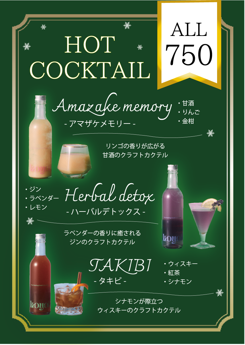 ・ホットカクテルを売りにしたいご要望だったので、ドリンクのPOPだけ背景色を深めの緑に変えて、特別感を出しました