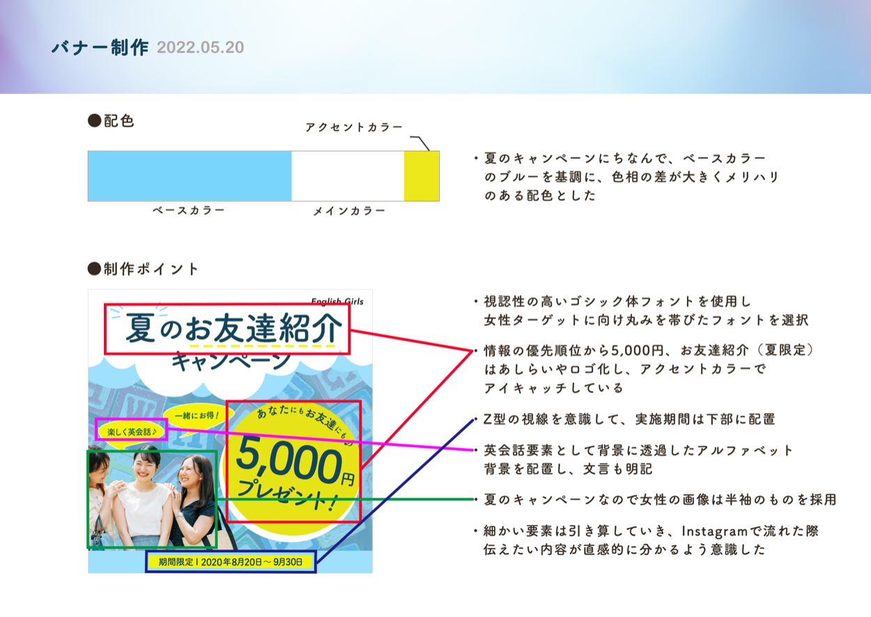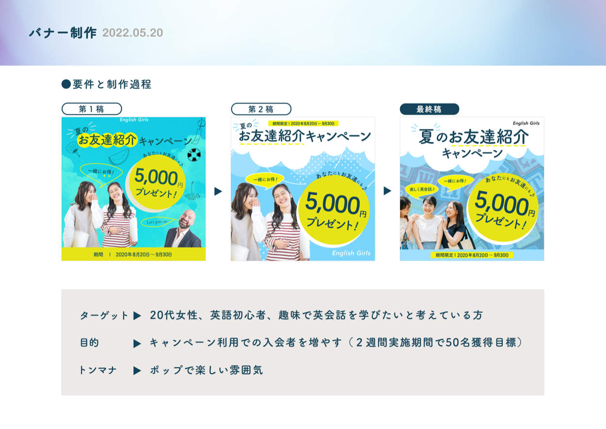 - 架空クライアント:English Girls(20台女性をメインとする初心者向けのライトな英会話教室)