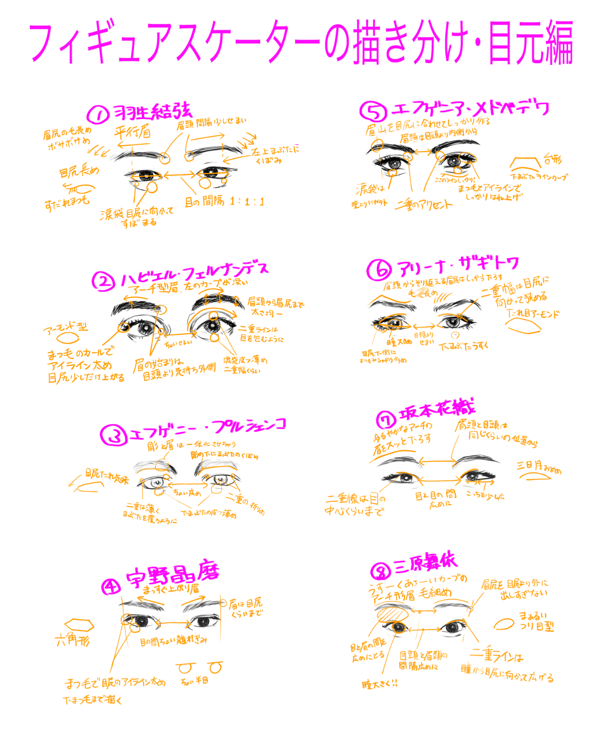 イラストタッチでも本人と判るよう、顔パーツの特徴をまとめたイラスト