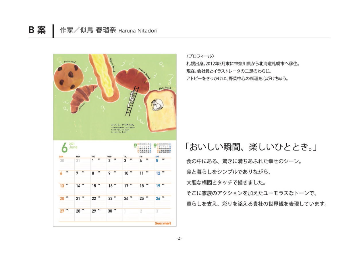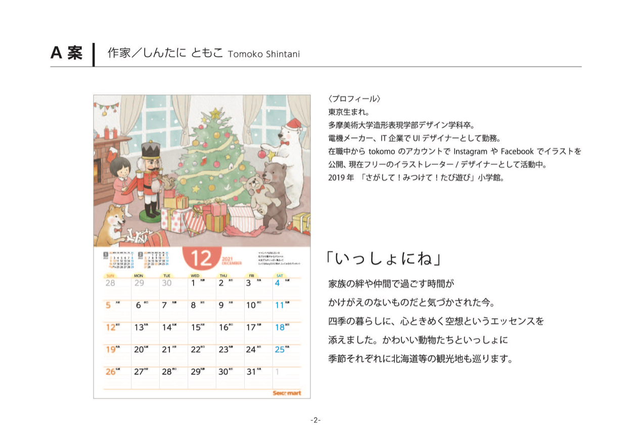セイコーマート様 カレンダー イトウユカ グラフィックデザイナー OVERVIEW セイコーマート様で配布する、カレンダーのコンペティションに参加しました。 イラストレーターさんの選出から、コンペ用の発表用資料の作成までに携わりました。