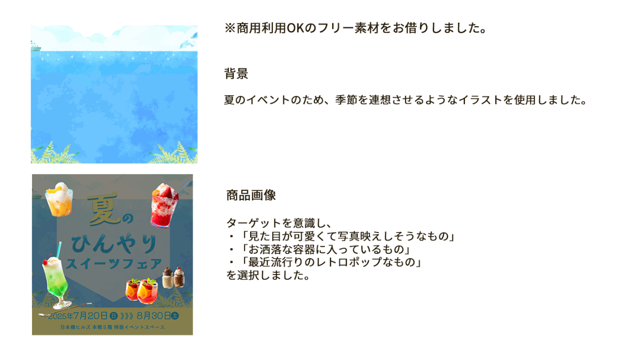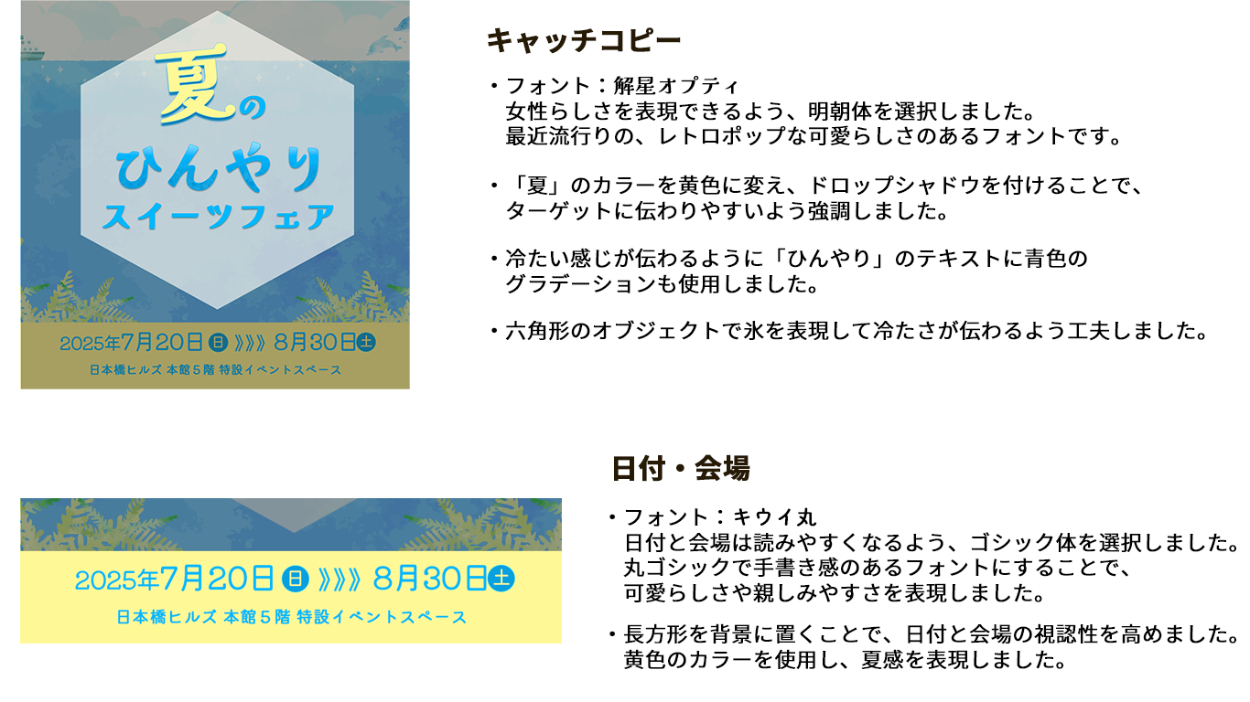 夏の温かさと冷たい食べ物を食べた時の爽やかさ・ひんやり感・涼しさを想起させるようなカラーにしました。ターゲットに合わせ、パステルカラーを使用して可愛らしさを表現しました。