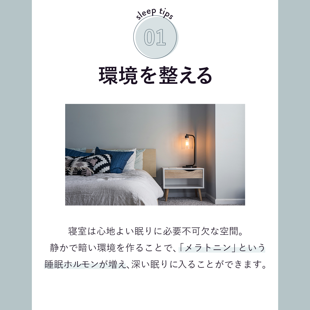 練習課題《SNS用バナー制作》 山中明音 フリーランス OVERVIEW 心地よい睡眠のためにやること3選 ① 【サイズ】幅1080px x 高さ1080px【工夫したポイント】落ち着いた雰囲気にしたかったので、ブルー系でまとめました。見出しは大きくして、本文は大事なところに下線を引いて強調しました。