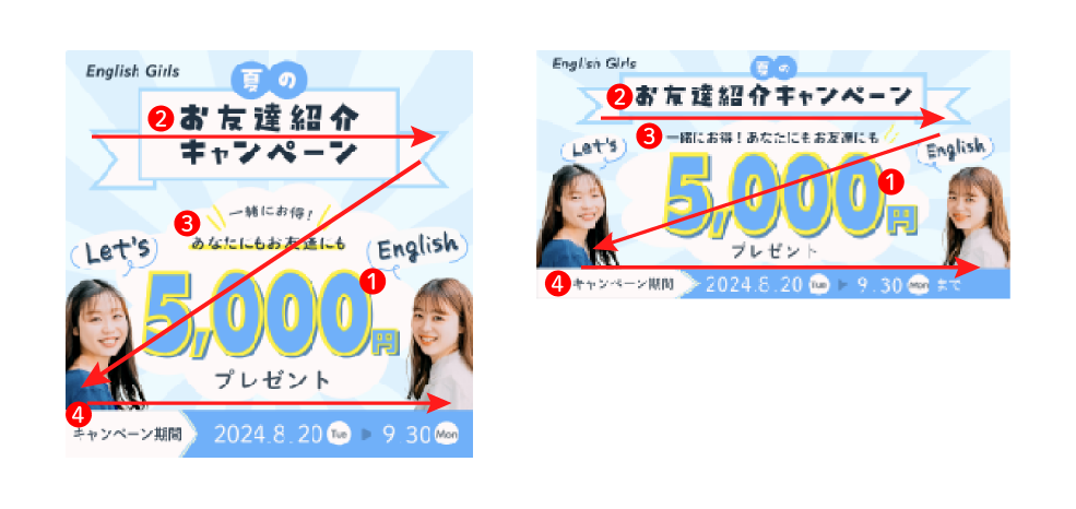 - 「一緒にお得!」「あなたにもお友達にも」は、2列・1列どちらの場合でもセットで認識されやすいよう配置を揃え、可読性を意識しました。