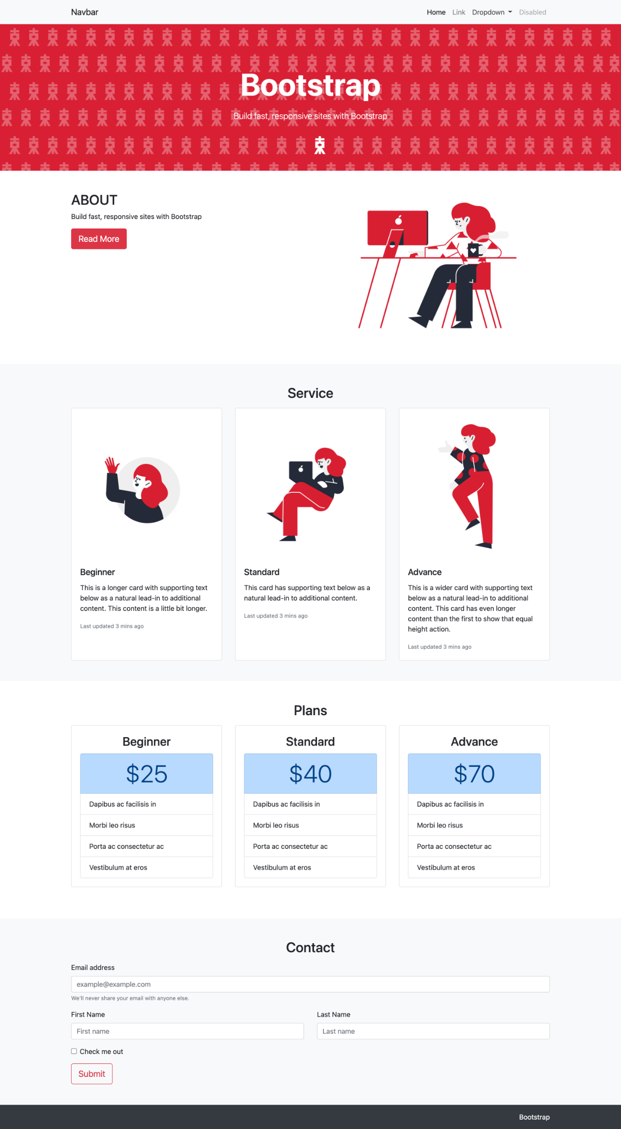 Bootstrapを利用したコーディング まいまい Web系フリーランス OVERVIEW Bootstrapを利用して制作したサイトのサンプルです。制作時間は1時間ほど。レスポンシブ対応済み。 YEAR 2020 サイト全体図 WEBSITE