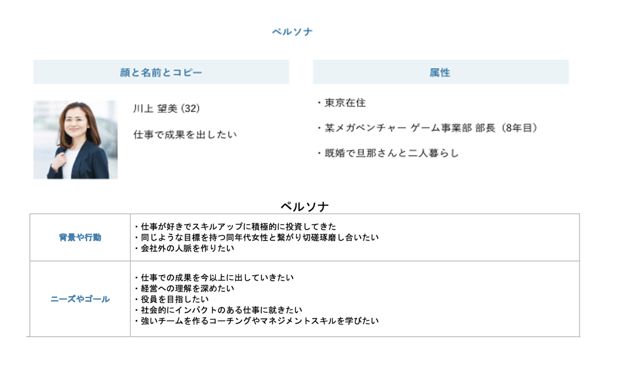 女性向けのビジネススクールを展開している。 会員は20~30代の女性が多く、 キャリアアップのためにビジネススキルを学び、 さらにそのアウトプットの場として定期的にビジネスコンテストなどのイベントも開催されている。