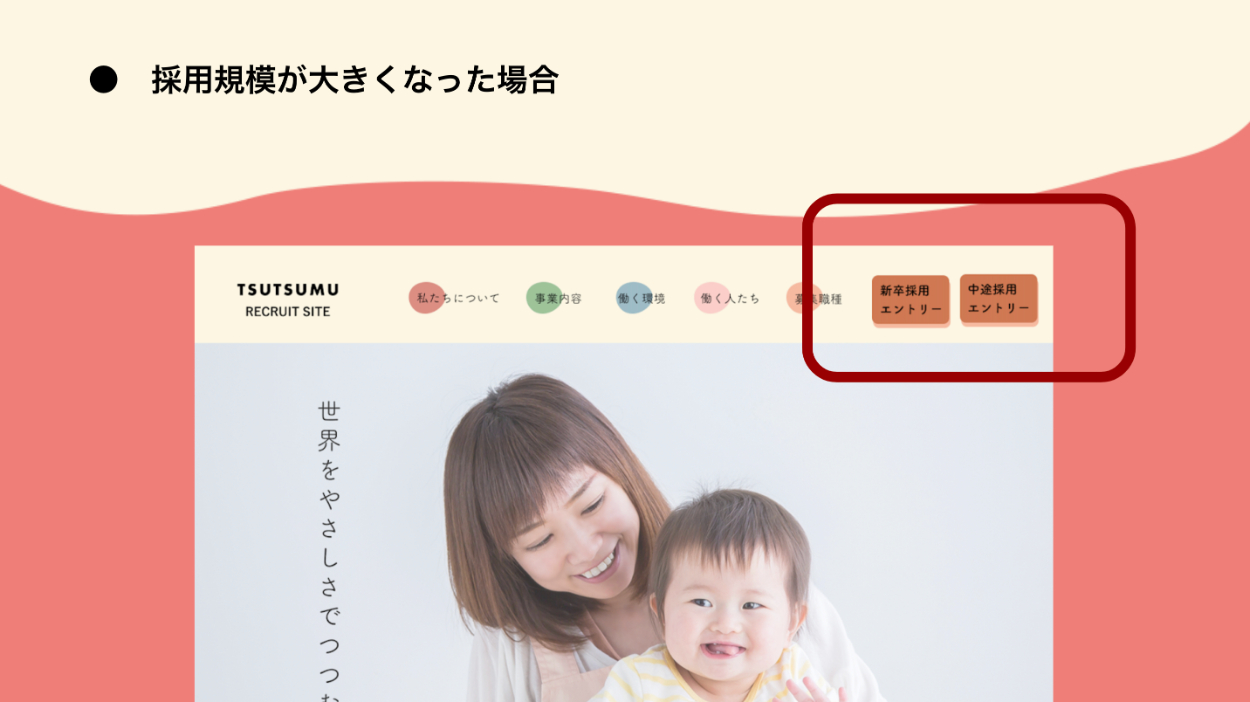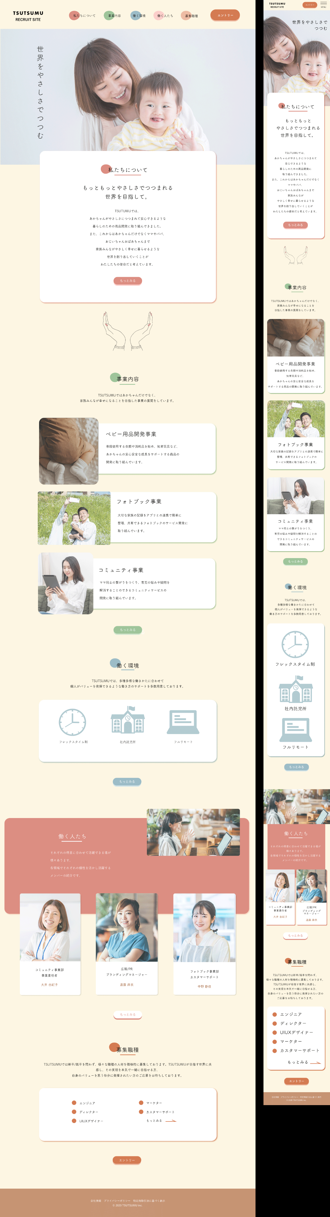 SHElikes MULTI CREATOR PROJECTの課題で、ベビー用品事業等を行う企業の採用サイトの制作に取組みました。クライアントからの要件書を元に、PCとSPのデザインカンプを制作し実装を行いました。SP用のレスポンシブ対応もしています。