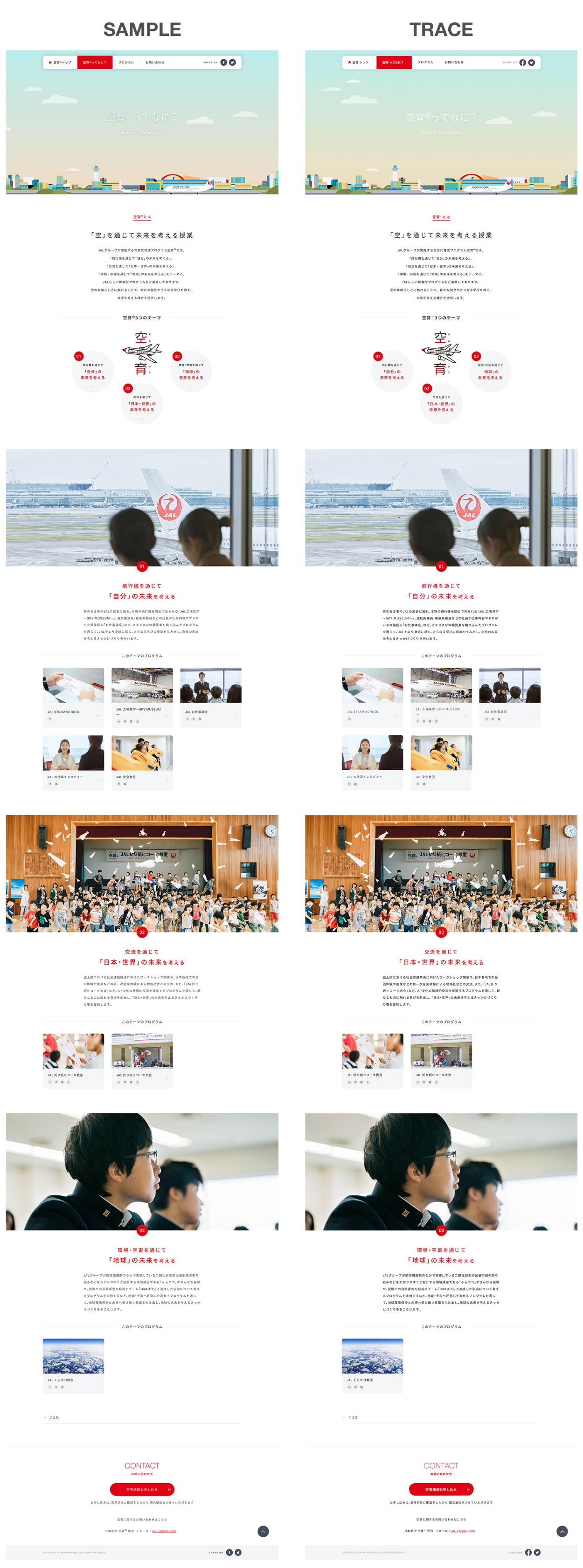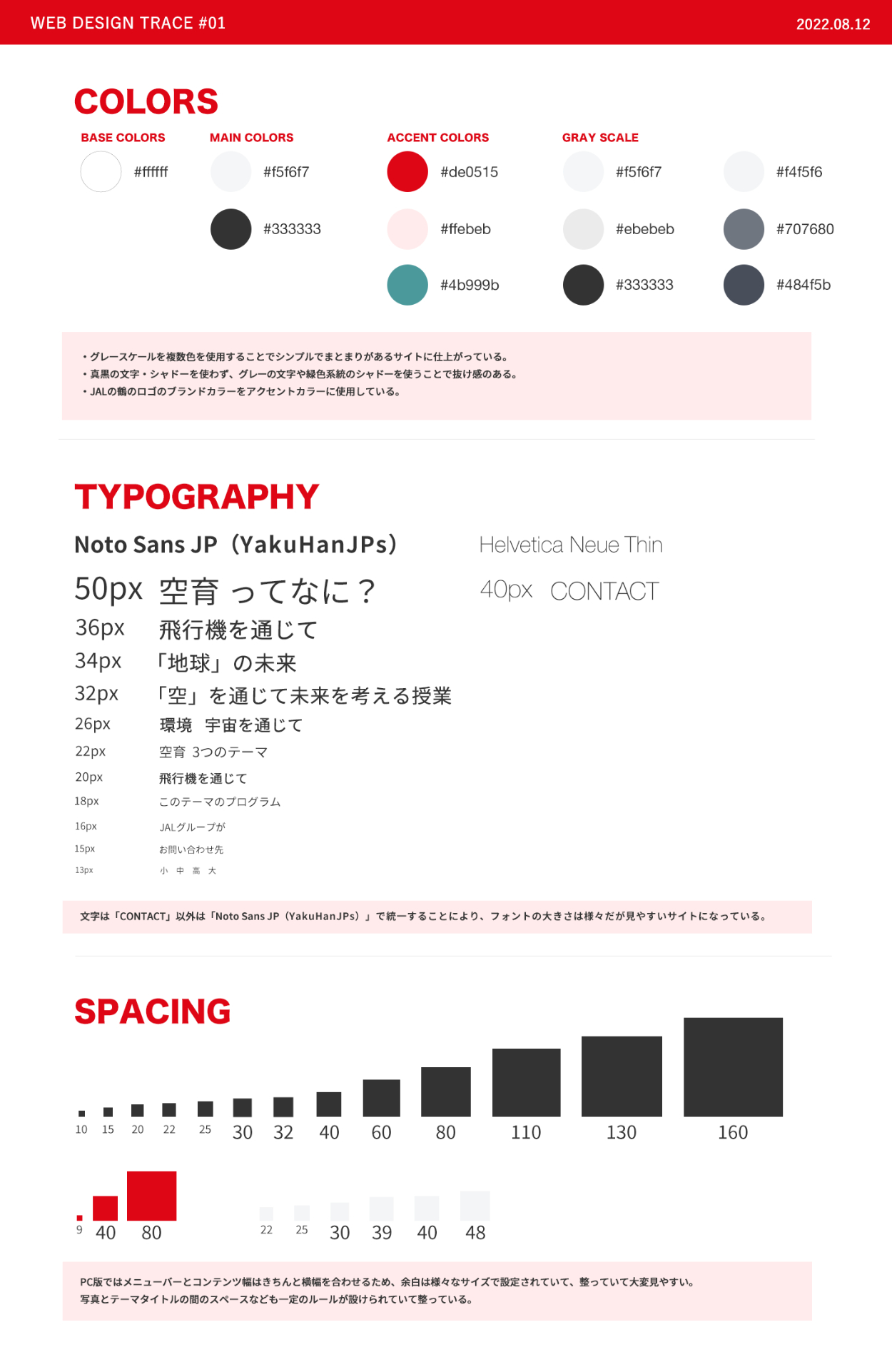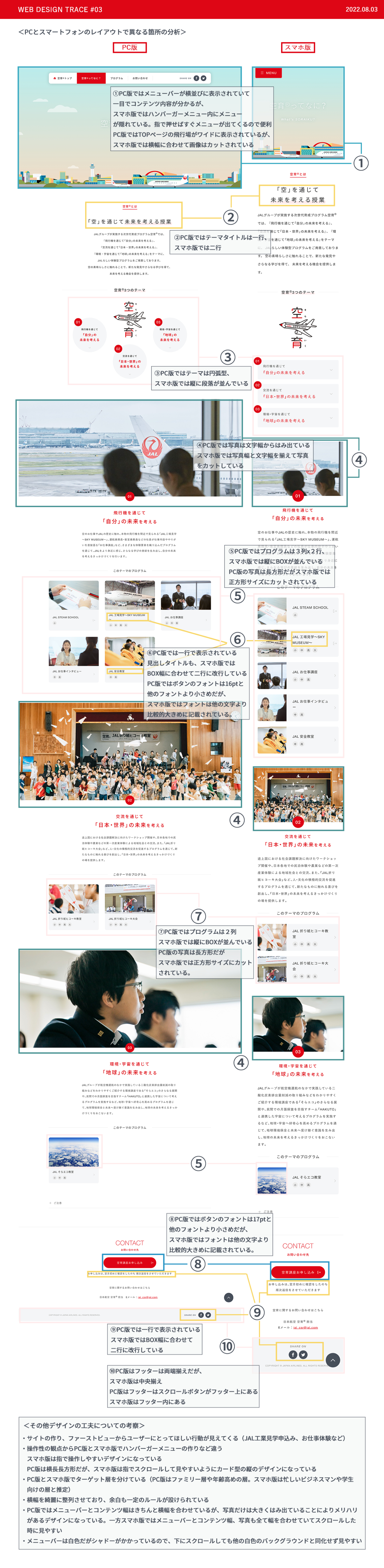 JAL「空育」のLPトレース・スタイルガイドの制作・webページのトレースと分析の制作を行いました(SHElikes MULTI CREATOR COURSEの課題)。 プロが作成したデザインからデザインの知識(webで使用されるタイポグラフィ、カラー、余白、PCとSPのレイアウ