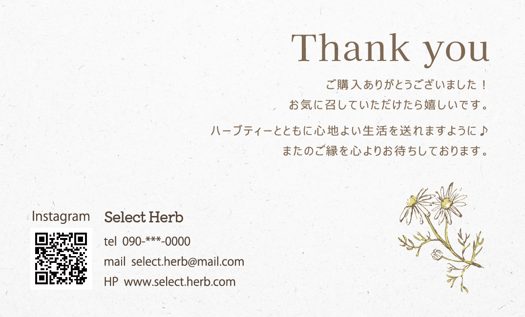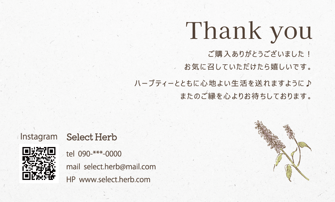茶色の文字色やクラフト紙の背景により、ナチュラルで心地よい雰囲気を表現しました。イラストは、購入したハーブの種類や季節に合わせて変更し、リピーターが温かい気持ちになるようなデザインを意図しています。