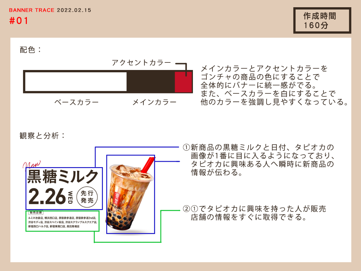 このトレースの際は、すぐに作業に取り掛かったのですが、「全体構成の把握」「配色や工夫について言語化」「再現方法が不明な箇所を調べる」など、バナートレースにすぐ着手するのではなく、大まかに必要な情報を集め、進め方を計画するようになりました。そうすることで、トレースの目的もハッキリとし、作成スピードをあげられるようになりました。