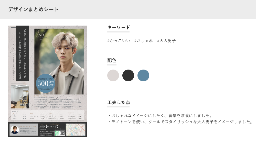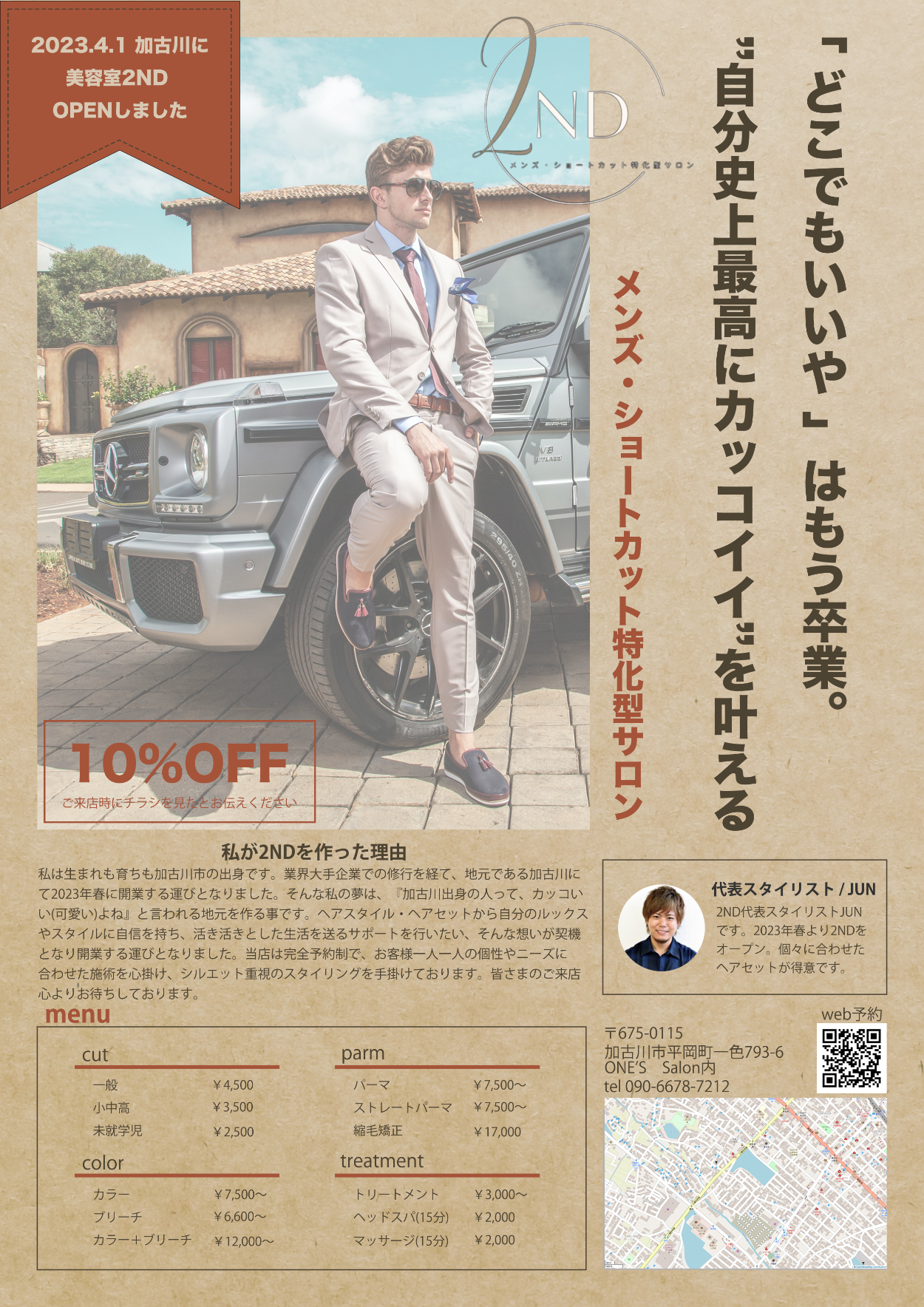 美容室チラシ あかね webデザイナー OVERVIEW メンズ・ショートカット特化型サロンのチラシを作成しました。 その他のパターン出し「男が憧れるかっこよさ」をコンセプトに出来る男をイメージして黒・ゴールドをベースに制作しました。西洋紳士系をコンセプトにベージュを基調におしゃれなジェントルマンをイメージして制作しました。