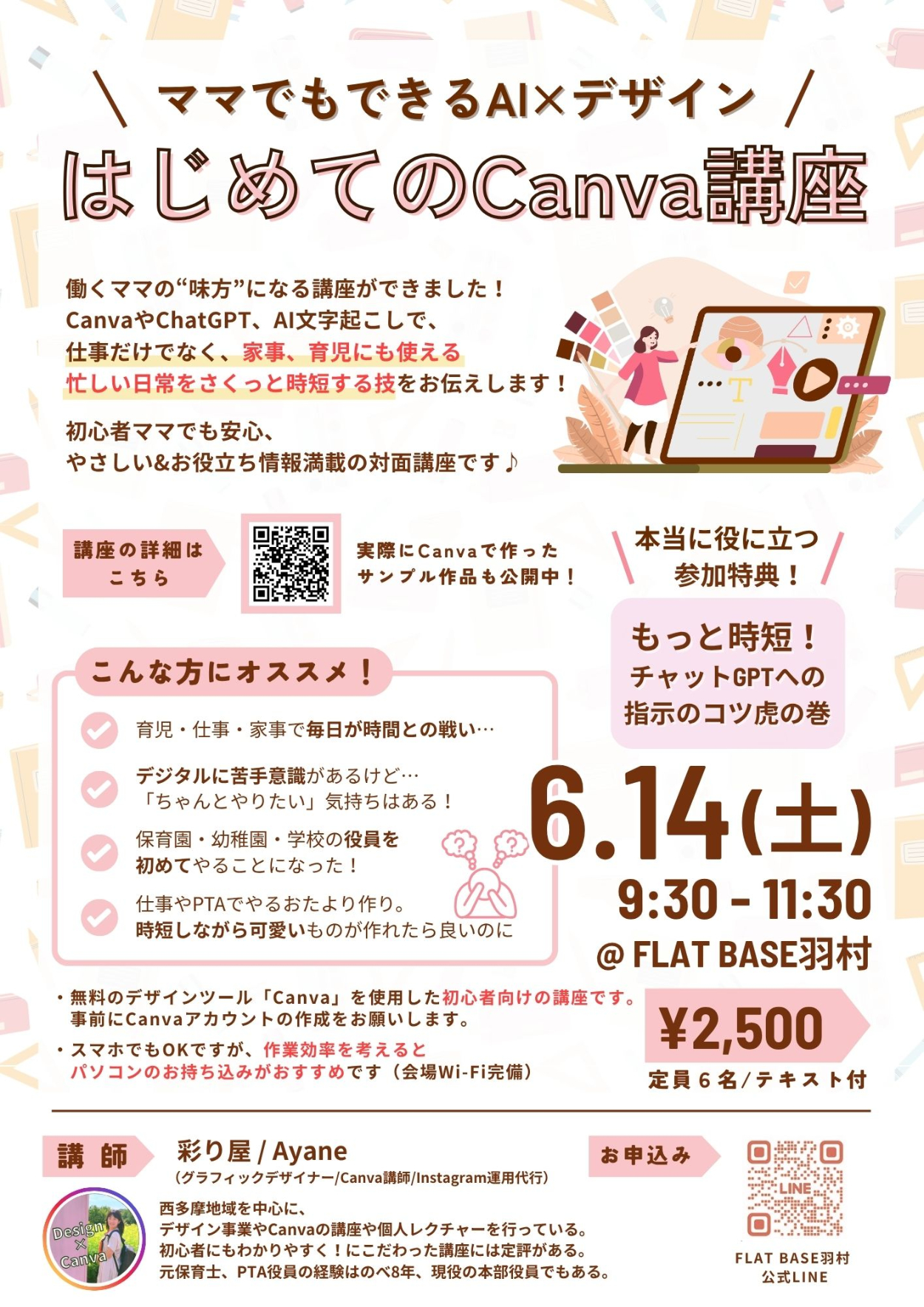 ・Canvaの基本操作とAI機能に特化した講座。忙しい母の皆さんにこそCanvaとAIで時短を覚えてもらいたいと思い開催しました。特典としてお配りした「日常生活に活用できるchatGPTのプロンプト(指示文)集」が好評をいただきました。