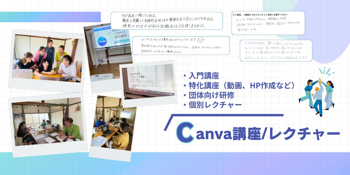 デザインツール『Canva』を活用する各種講座。 初心者のための入門編から、HP作成講座、ショート動画講座などの特化講座も。 『分かりやすさ』を大切に、団体向け研修や個別レクチャーも行っています。