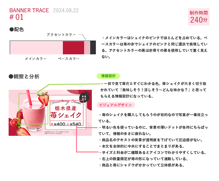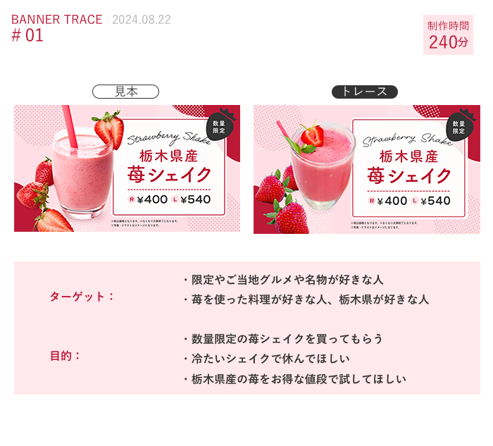 SHElikes MULTI CREATOR COURSEでの課題、バナートレースに取り組みました。ターゲット、目的、配色等についての分析結果もまとめました。[制作時間:240分 使用ツール:Photoshop]