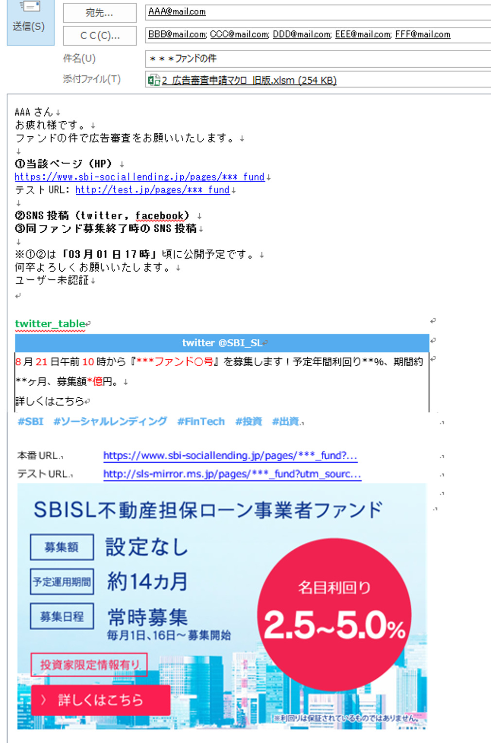 「広告審査」ボタンを押すとメールが作成される