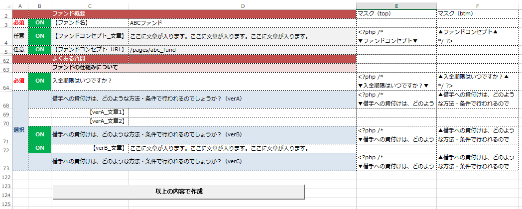 - テンプレートとなるPHPソースに【ファンド名】【ファンドコンセプト_文章】などの文言を入れておいて、それをセル内の文言で置換していくプログラム。
