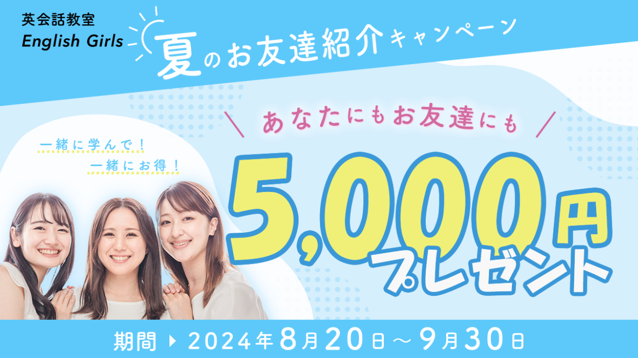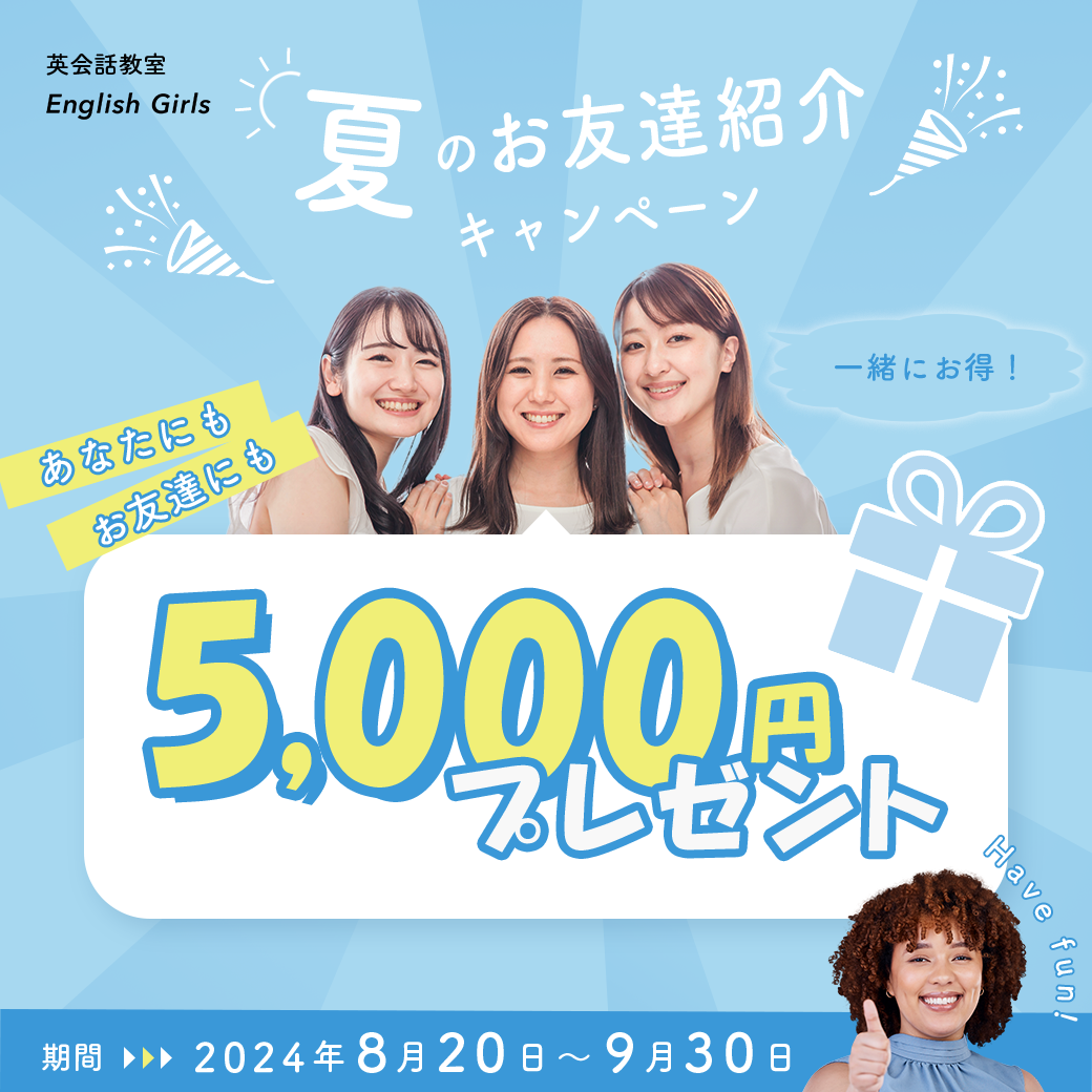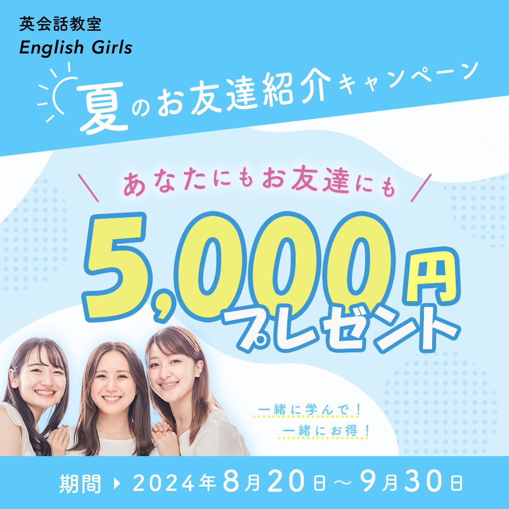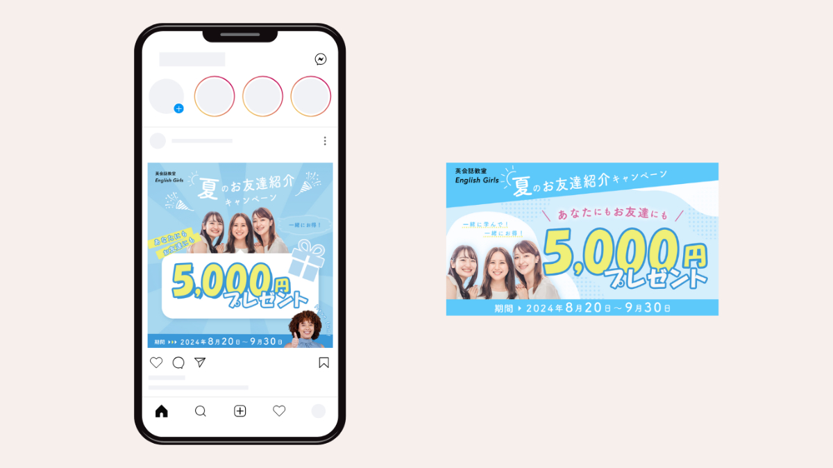 英会話教室のInstagramキャンペーン告知バナーを制作しました。ターゲットは20代の女性で、明るく親しみやすい印象と、特典(5,000円プレゼント)がすぐ伝わる視認性を意識しました。
