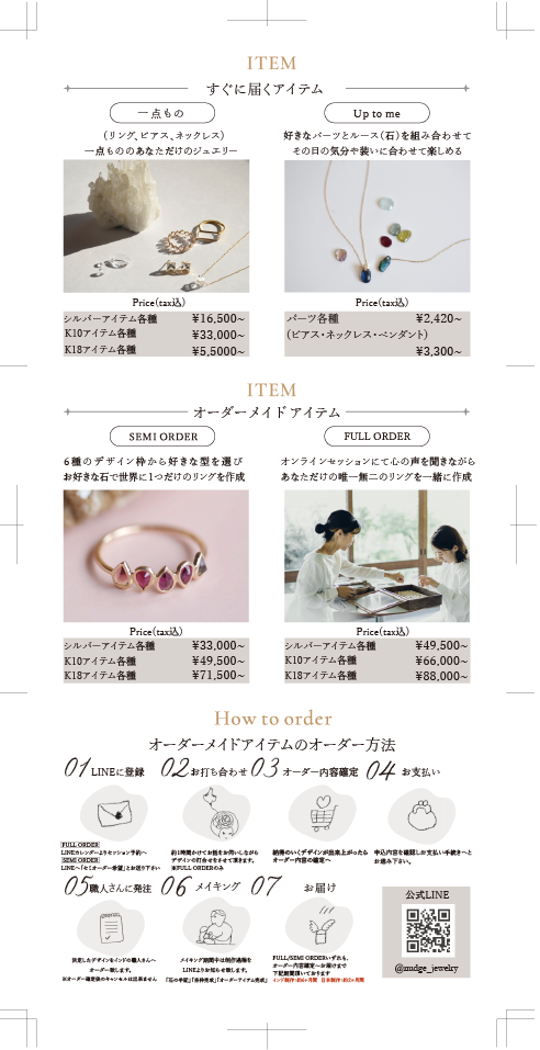 ブランドのコンセプトや持っている世界観をしっかり意識し、装飾は加えすぎず、読みやすくて、品のあるデザインに仕上げました。(シンプルかつブランドに込められた想い、各種SNS、取り扱っている商品の種類、値段などが一目見ただけで瞬時に判断できる)
