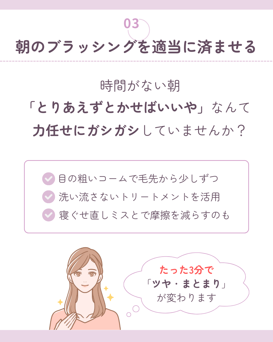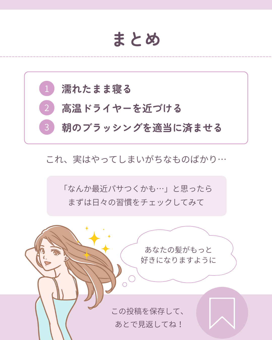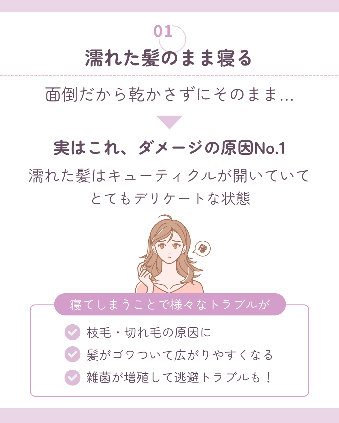 20代後半から30代前半の女性向けに、美容アイテムやお役立ち情報を発信するアカウント運用者として、美容に関するお役立ち情報「髪が痛むNG習慣」のフィード投稿を想定して制作しました。※自主制作