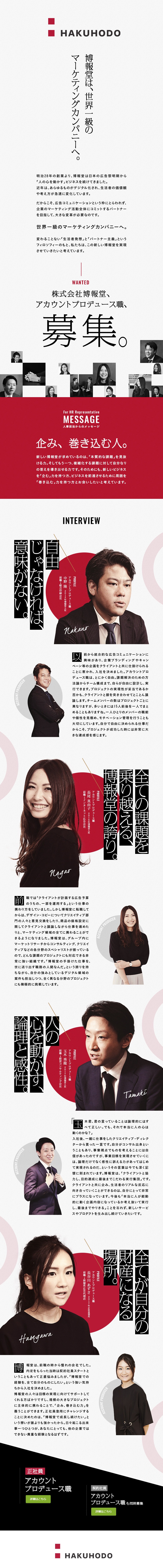 ターゲットに伝えるコピーとして、当時の人事担当者の言葉をヒントとした「企み、巻き込む人」という言葉を採用。LP制作の過程では、実際にインタビューをした個々のバックグラウンドが異なる方々が、その仕事の魅力について語ることで実際に「企み、巻き込む人」を体現する一人として、ストーリーを交えながら紹介する構成をとりました。ストーリーの中では、博報堂という組織だからこそ実現できるプロジェクト規模と影響力、その裁量の大きさにも触れることで、マーケティング企業へと変貌しつつある、唯一無二なユニークな存在であることを伝えています。