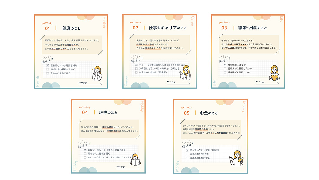 方眼紙のデザインやマーカー風のあしらいなどで、重要な部分を目立たせ、読みやすさも意識しました。