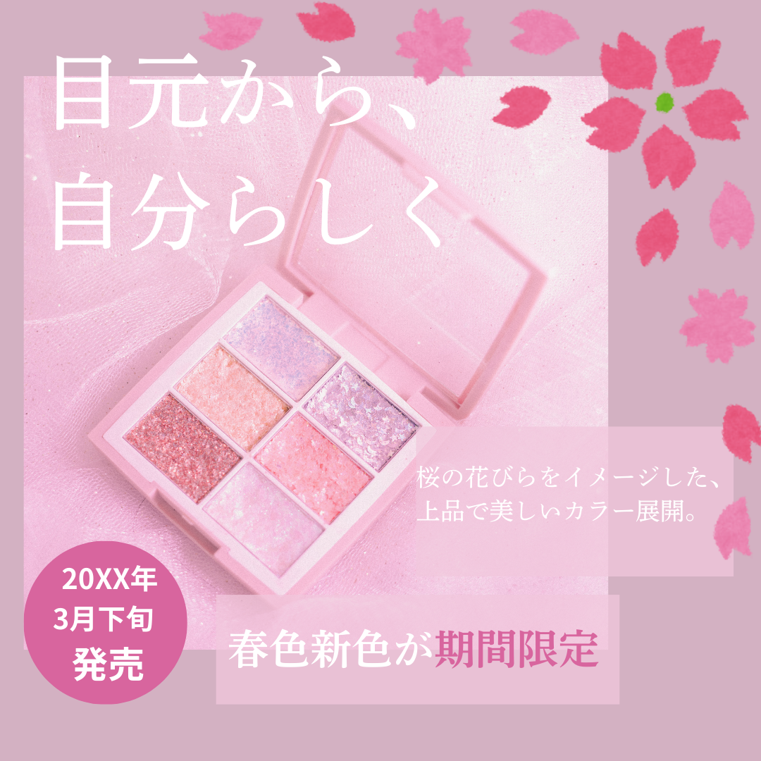 [HerTech] 自主課題 アイシャドウ バナー ナオミ フリーランスwebデザイナー 〇要件【HerTec】の自主課題 アイシャドウのバナー〇ターゲット20代女性〇使用したツールCanva〇作成時間約4時間〇こだわったこと女性らしさが感じれるようにピンクを基調として作った。春の期間限定の商品のため、桜のイラストを加えた。発売日や「期間限定」など重要な部分には濃いピンクを使った。