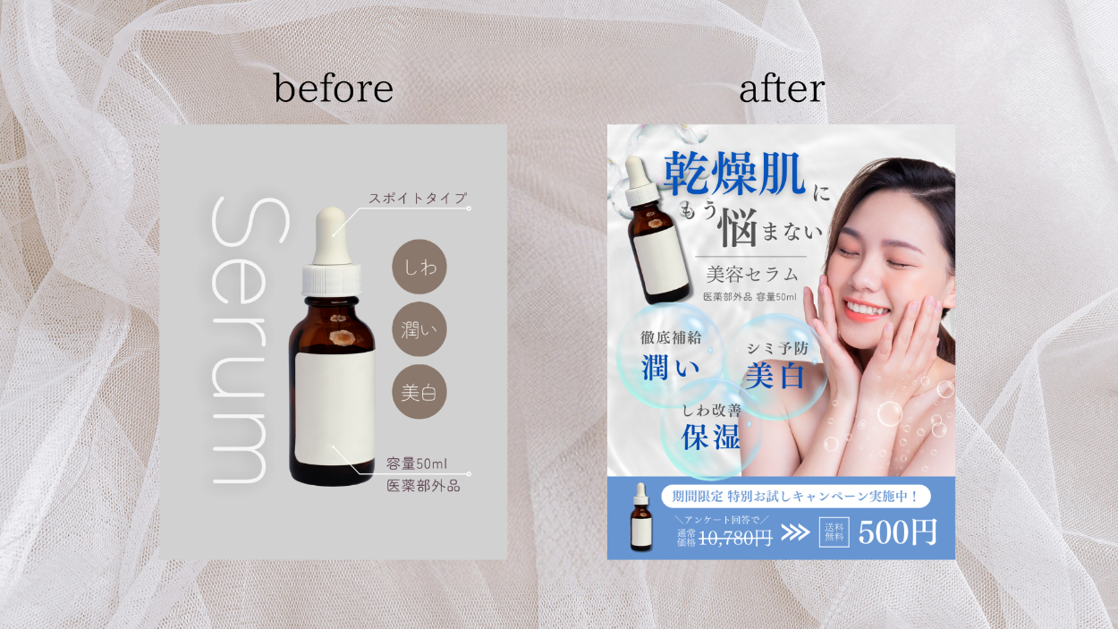 ・Beforeでは暗い印象があったため、明るい色にし、水滴など潤い感を出した写真を使用しました。また、実際に使っている人を見せたほうが、より具体的にイメージしてもらえると考え、女性の写真を使用しました。
