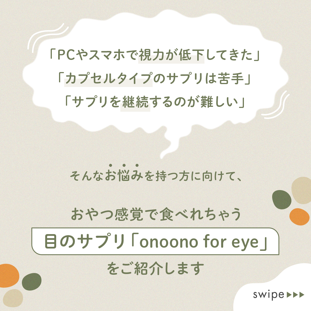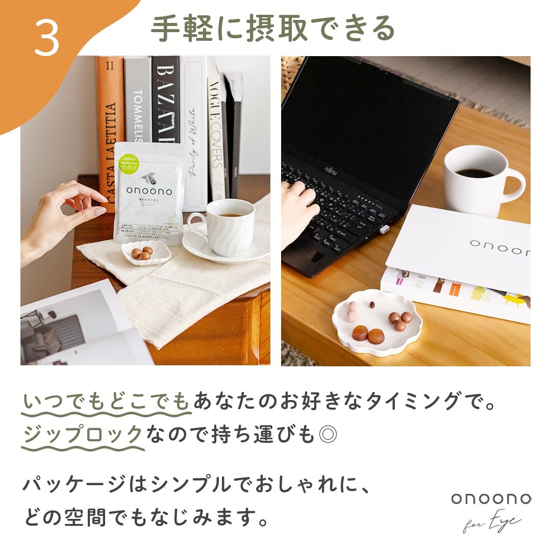 - 『onoono for eye』はただ栄養を摂るだけではなく、その過程を楽しむことを大切にしているサプリメント