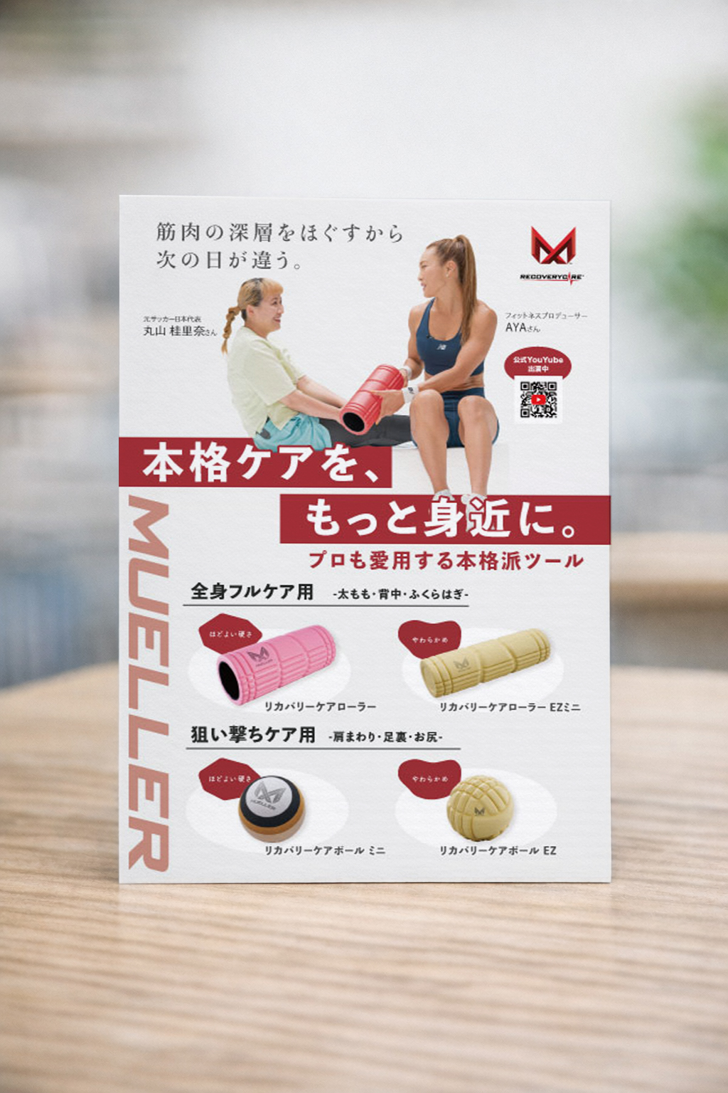 スポーツ関連企業の販促POPデザイン制作 ・店頭用ビジュアルの構成、レイアウト、コピー設計を担当 ・商品特徴(セルフケア・リカバリー訴求)を分かりやすく表現